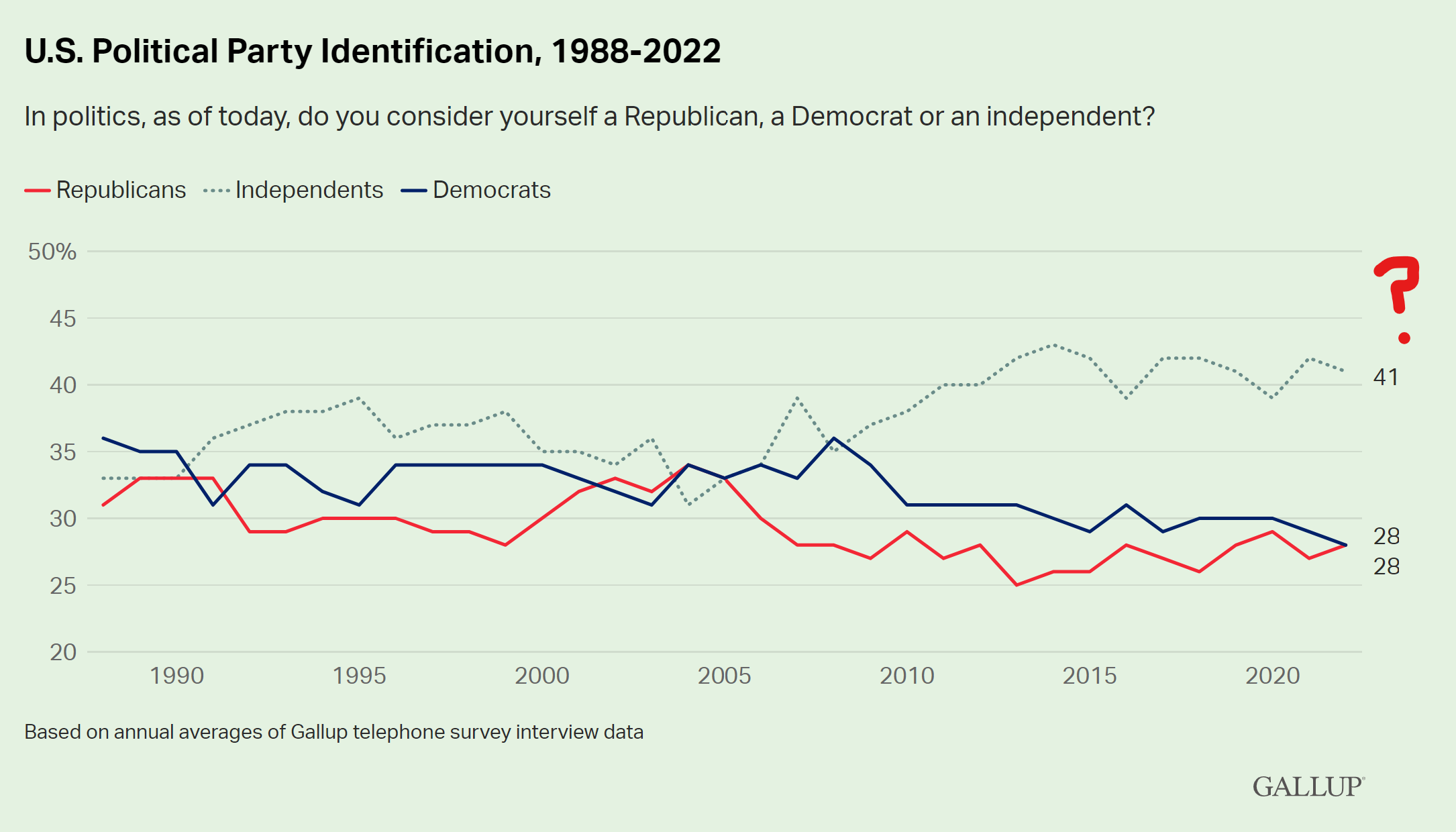 There’s no doubt independents continue to rise and party loyalty continues to erode. One problem I see with fully evaluating this is response bias — that pesky little footnote in polling that must account (and often doesn’t) for which kinds of people actually respond to surveys and which particular forms of surveys. This can certainly skew results. When Gallup releases its report later in January, we’ll see which way these lines tick, either up or down…which will give us a slightly better picture of how 2023 panned out.